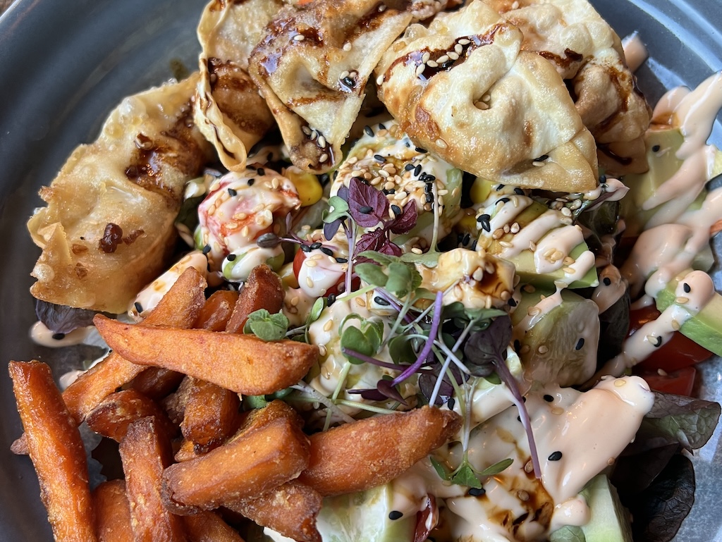 Moderne Burger, Bowls, Shakes und mehr mit Blick auf die hauseigene Kletterhalle. (V+)